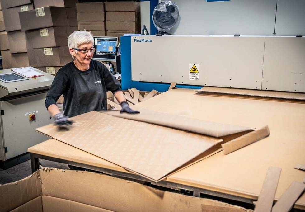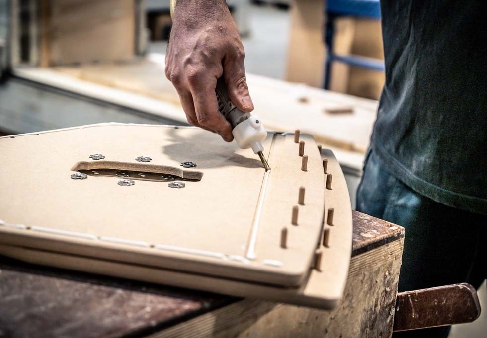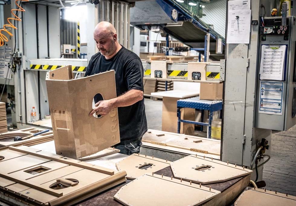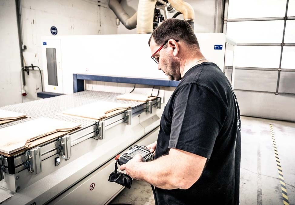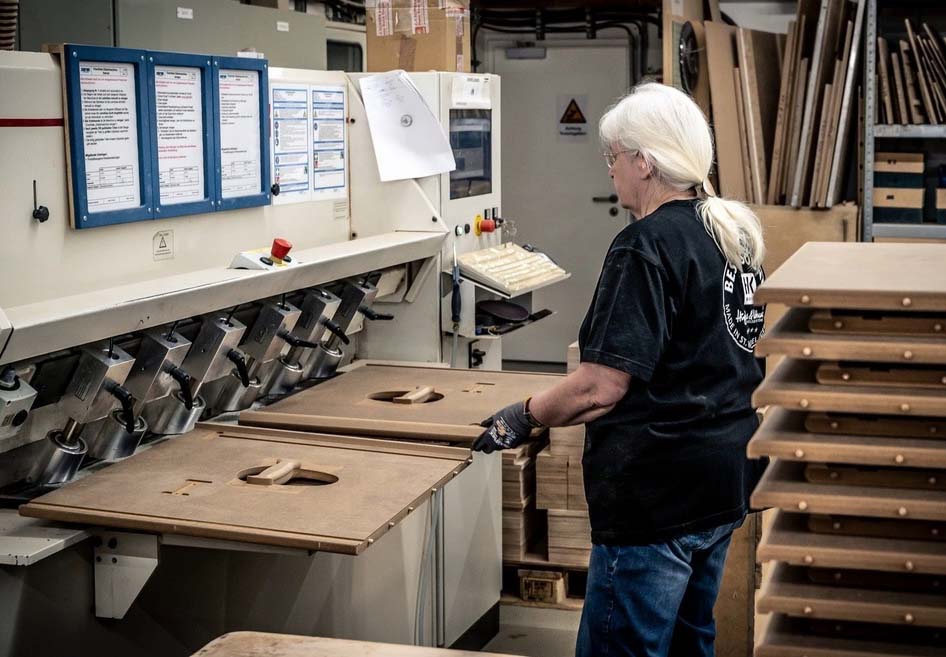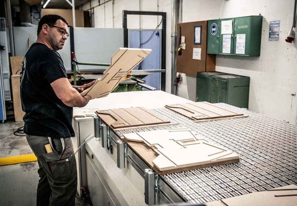 Sau khi các tấm gỗ được cắt theo kích thước, chúng sẽ được sử dụng trên máy phay CNC để cắt và khoan tất cả các lỗ và vát các cạnh.
