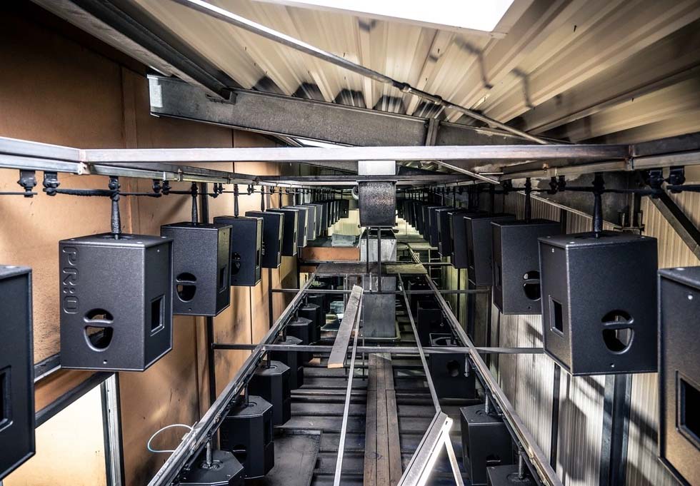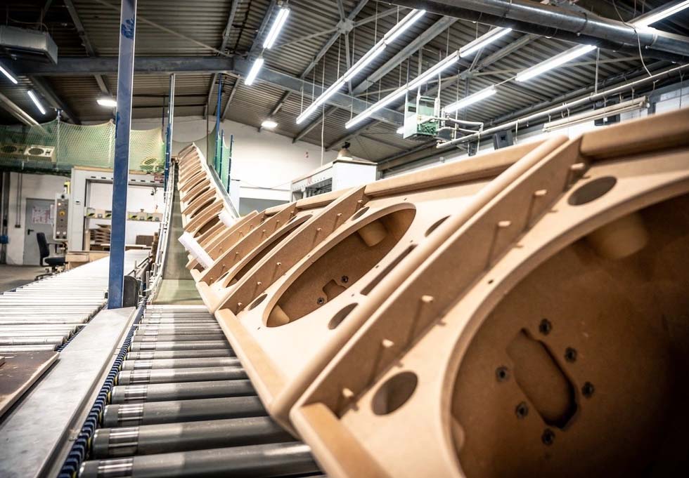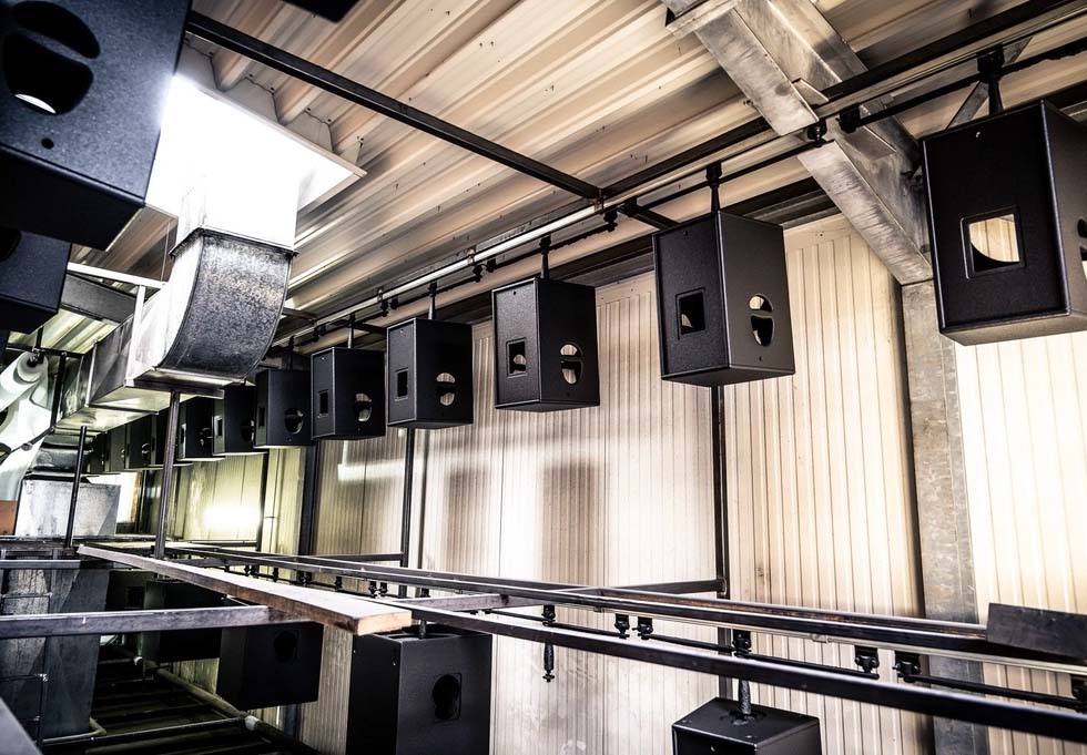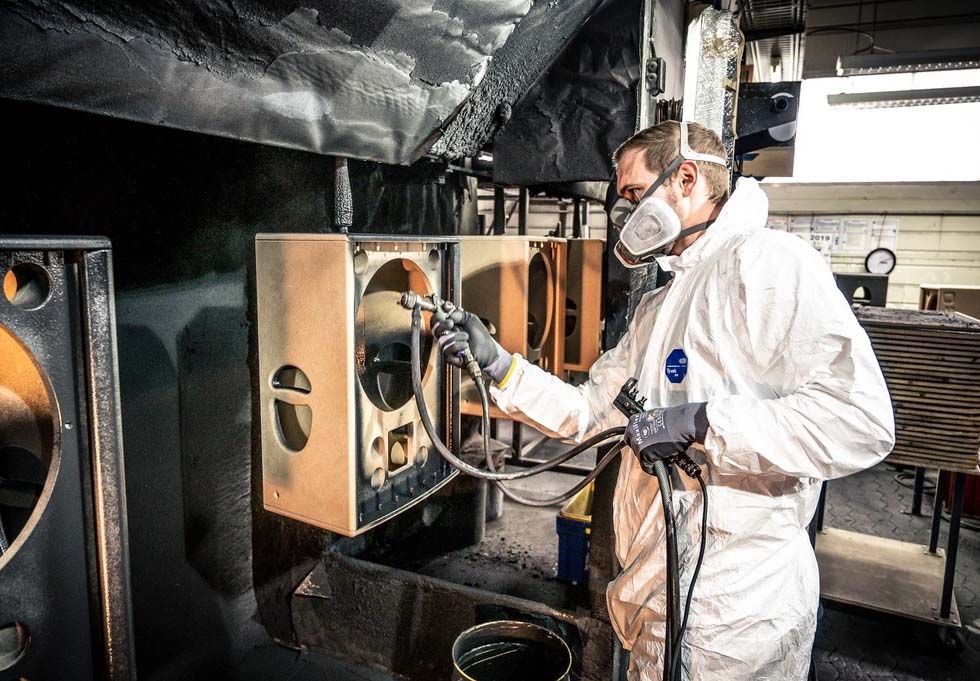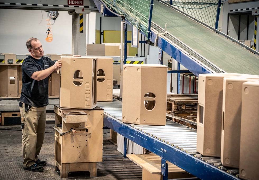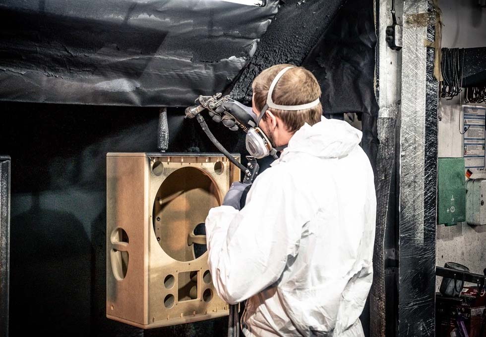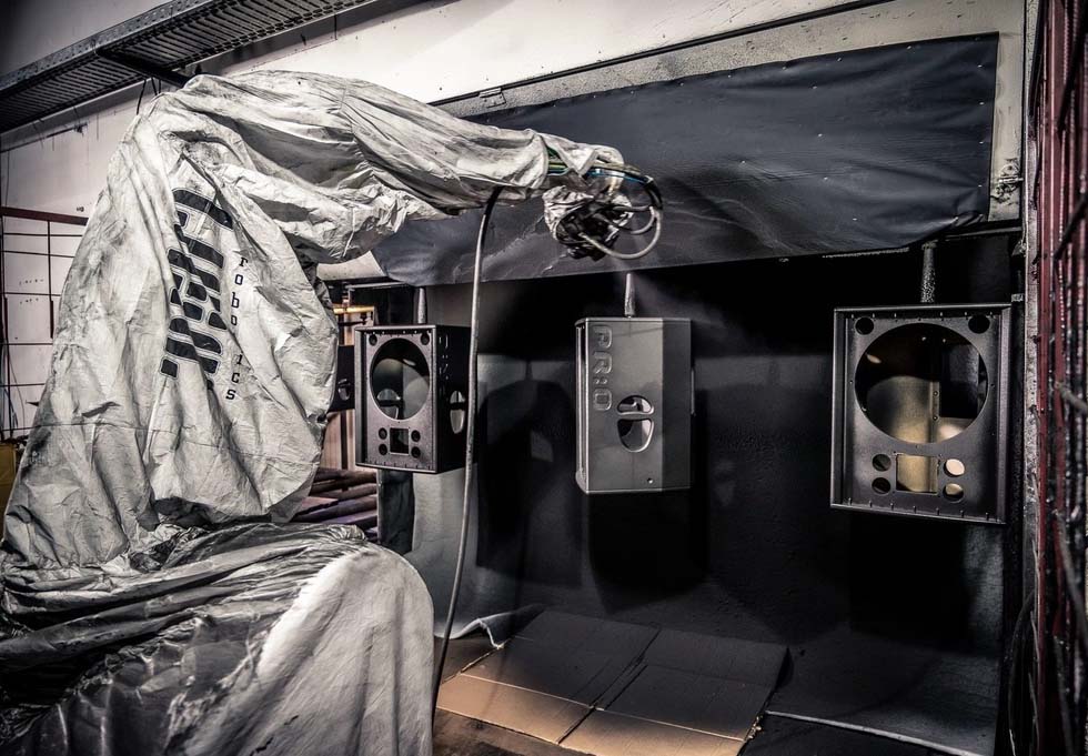 Một băng chuyền đưa các thùng loa từ xưởng mộc đến dây chuyền sơn tự động. Những thùng loa chưa hoàn thành được chuyển đến một buồng phun hoặc máy sơn.